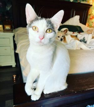 1 md-long haired white male with one blue and one green eye. Female Tuxedo Domestic Long-haired. Cat and kitten.